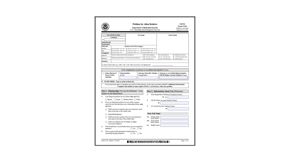 Форма I-130 является основополагающей при иммиграции в США через семью. Через эту форму гражданин США или владелец Грин Карты (“Заявитель”) просит Иммиграционную Службу США предоставить вид на жительство своему родственнику (“Бенефициар”).