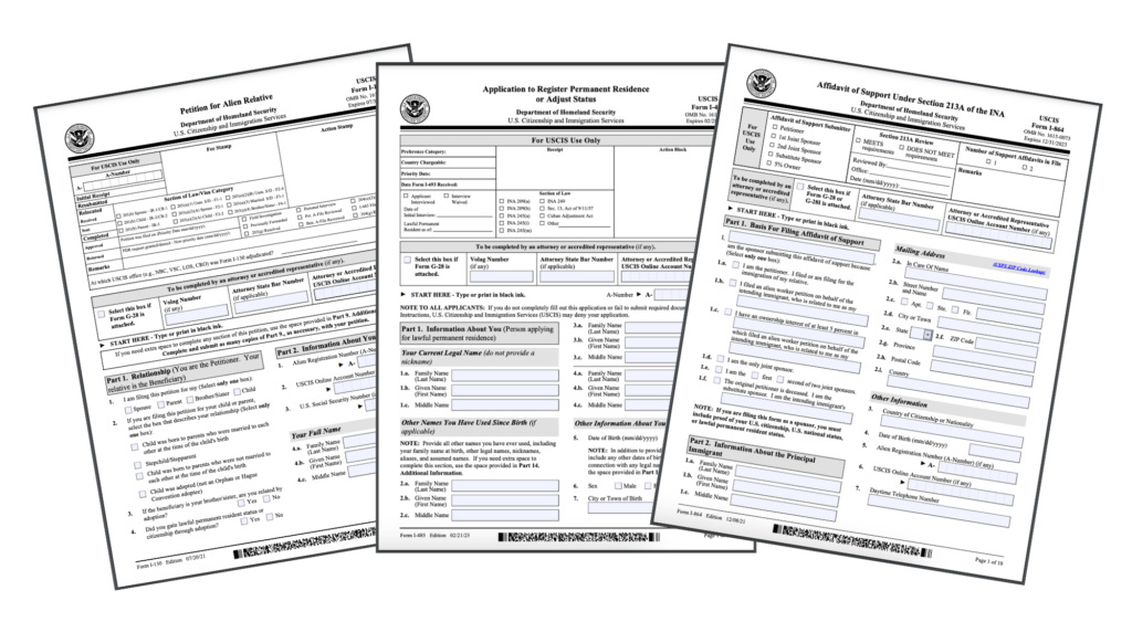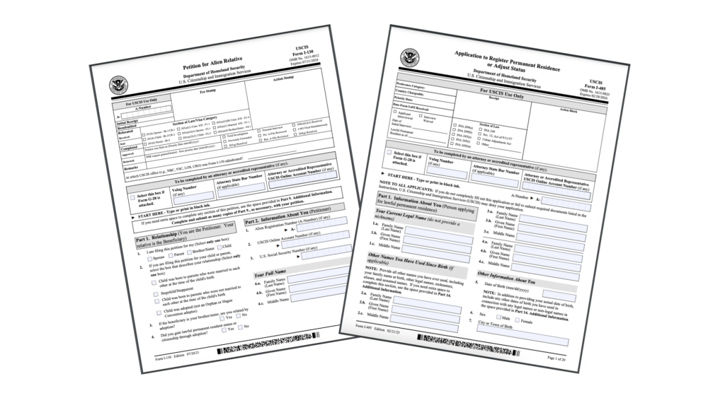 Супруги, родители и несовершеннолетние дети граждан США могут подавать форму I-485 единовременно с подачей гражданином формы I-130.